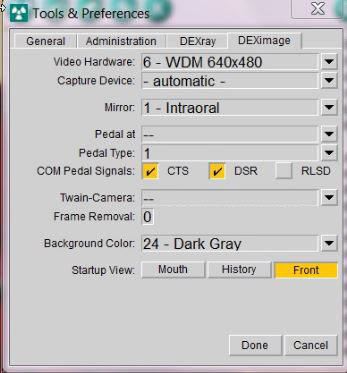 This will mean the Deximage setting is still on simulation. Access these settings from the Dexis Administration page by clicking on the wrench icon located in the top right corner. Select the DEXImage tab to access imaging settings. Under Video Hardware select WDM 640x480 or 1920x1080 (Plus+ Camera Only)